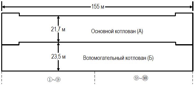 Примыкающий вспомогательный котлован (Б) имел длину 155 м, ширину по большей части длины 23,5 м и глубину 17,76 м. Для него также было предусмотрено 5 ярусов распорок: в первом ярусе сверху – железобетонные распорки, в остальных – стальные.