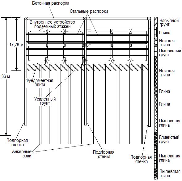 Готовое сооружение должно иметь два подземных этажа и свайно-плитный фундамент. Грунт под железобетонной фундаментной плитой был усилен на глубину 3 м от ее подошвы. Нижние торцы свай находились на глубине более 36 м от дневной поверхности.