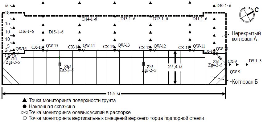 Чтобы полностью понять деформационное поведение глубокого котлована во время строительства, при его создании выполнялся комплексный мониторинг. В основном отслеживались горизонтальные (с помощью наклонной скважины) и вертикальные смещения подпорной стенки, осевые усилия в распорках, осадки дневной поверхности, окружающих зданий, проходящего поблизости трубопровода, дна котлована, а также уровни подземных вод.