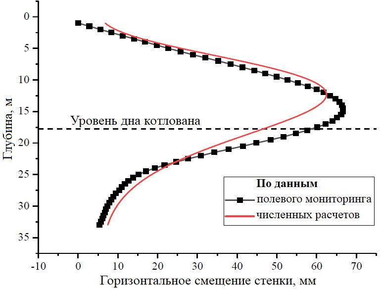 Из данных полевого мониторинга и численного моделирования видно, что максимальное горизонтальное смещение «стены в грунте» при откопке котлована до дна происходит примерно на 5 м выше дна котлована.