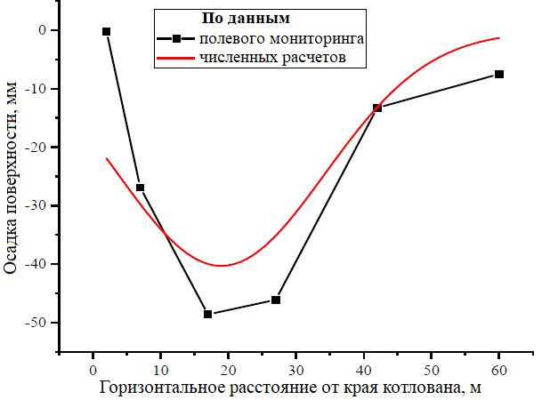Результаты конечноэлементного моделирования горизонтальных смещений подпорных стенок и осадок поверхности вокруг котлованов при выемке грунта до дна хорошо согласуются с данными полевого мониторинга.