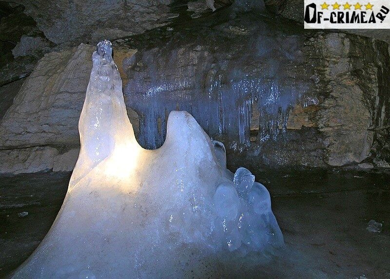 Главная достопримечательность этой пещеры – постоянный ледяной конус, достигающий в высоту 7 м. Образовавшаяся при его таянии вода разливается по полу и замерзает, постепенно превращаясь в прослои ископаемого льда мощностью в несколько метров. На его поверхности можно увидеть блестящие монетки, которые оставили многочисленные туристы, посещающие эту пещеру Крыма.