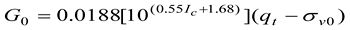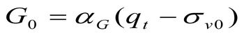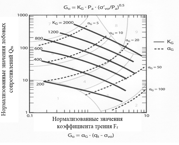 При низком уровне касательных напряжений и малых деформациях сдвига модуль сдвига может рассматриваться как константа, имеющая максимальное значение. В то же время была установлена связь модуля сдвига с нормализованными значениями действующих напряжений и чистым сопротивлением конусу: