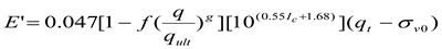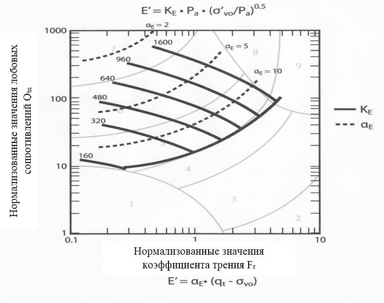 Очень существенным достижением в области приложения результатов зондирования к оценке деформационных свойств грунтов является установленная зависимость между модулем упругости E’ и чистым сопротивлением конусу (qt – σv0), подтверждённая на большом массиве данных по несцементированным силикатным пескам четвертичного возраста, когда Ic <2,6 [7]:(12)