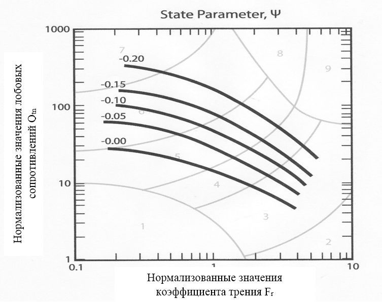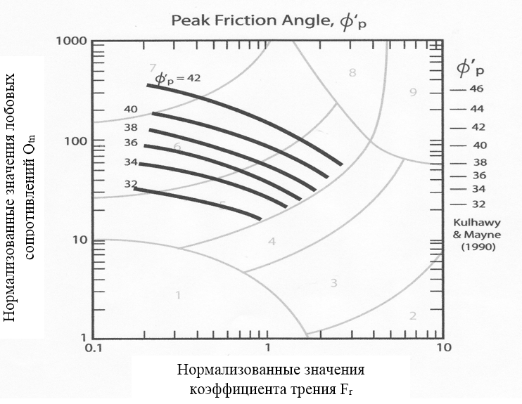 На приведённом графике видно, что, когда нормализованный коэффициент трения Fr возрастает (соответственно возрастает сжимаемость грунта), нормализованные значения лобовых сопротивлений уменьшаются при постоянном значении угла трения. Это согласуется с фактами наблюдений, когда высокие значения угла трения φ’p в сильно сжимающихся карбонатных песках соответствуют небольшим значениям лобовых сопротивлений. В области высоких значений φp на указанную зависимость может оказывать дополнительное влияние эффект цементации.