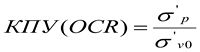 при этом в общем случае коэффициент переуплотнения КПУ (англ., OCR) представляет отношение максимальных эффективных напряжений, испытанных грунтом в прошлом σ‘p, к существующим эффективным напряжениям, определяемым нагрузкой от перекрывающих слоёв, σ’v0 и природным поровым давлением u0. (15)