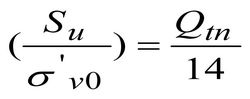 Ещё более сложные проблемы возникают при первоначальной оценке состояния глинистых чувствительных грунтов, в которых при зондировании развивается высокое избыточное поровое давление и коэффициент порового давления Bq>1. На основе исследований в калибровочной камере Джефри и Бина в 2006 году (Jefferies and Been, 2006) и последующих наблюдений Шаттла и Каннинга (Shuttle and Cunning, 2007), а также натурных измерений Райда с соавтрами (Wride at al., 2000), Робертсон предлагает использовать комплексный параметр состояния (ψ), который в случае глинистых грунтов (Ic>2,6) должен дополняться оценками коэффициента переуплотнения (OCR) [4,7]. Этот коэффициент, зависящий, прежде всего, от напряжённого состояния и пластической жёсткости, может использоваться для широкого спектра песчано-глинистых осадков, когда точное представление о модели грунта затруднено. (14),