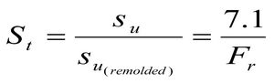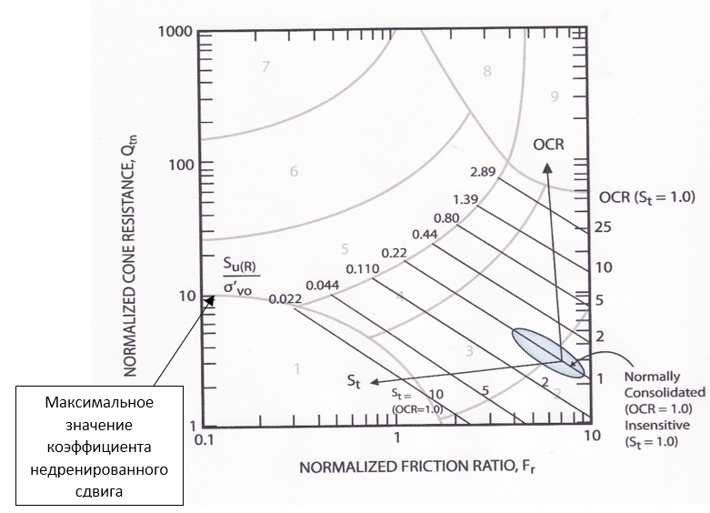 Для тонкозернистых глинистых грунтов установлено, что нормализованные значения сопротивления конусу Qtn и коэффициента трения Fr определяются не только степенью консолидации, устанавливаемой по коэффициенту переуплотнения КПУ (OCR), но и чувствительностью грунта St. Эта зависимость была исследована на основе установленной прямой связи боковых сопротивлений при зондировании со значениями недренированного сопротивления прямому сдвигу для перемятых глинистых грунтов. В высокочувствительных грунтах даже незначительные нарушения естественного сложения приводят к изменению показаний муфты трения, которые хорошо коррелируют со значениями сопротивления недренированному прямому сдвигу (Lunne at al., 1997) [4].