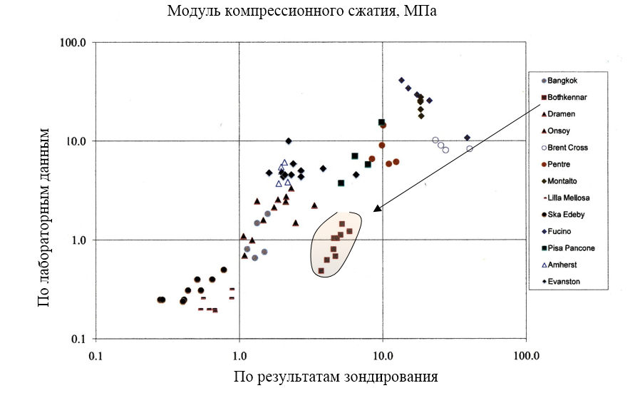 В большинстве случаев модули деформации, полученные по лабораторным компрессионным испытаниям, проверялись обратным расчётом на основе наблюдений за осадками для реальных сооружений [7]. В целом, совпадение результатов сравнения (см. рис. 7) достаточно убедительны, чтобы рекомендовать указанные выше зависимости (см. формулы 23-24) для оценки модуля деформации при компрессионном сжатии в пылевато-глинистых грунтах, когда преобладают вертикальные перемещения. При этом снимаются проблемы отбора образцов чувствительных грунтов, когда малейшие нарушения природного сложения оказываются решающими для достоверной оценки деформируемости грунтов. Конечно, в нормально консолидированных грунтах использование результатов зондирования для определения модуля деформации наиболее оправдано по сравнению с высокочувствительными глинистыми грунтами, где необходимо учитывать такие свойства как пластичность, влажность, содержание органики. Как указывает проф. Робертсон, именно эти факторы определили наибольшие отклонения от общей зависимости для объекта «Bothkennar» в Англии (см. рис. 7).
