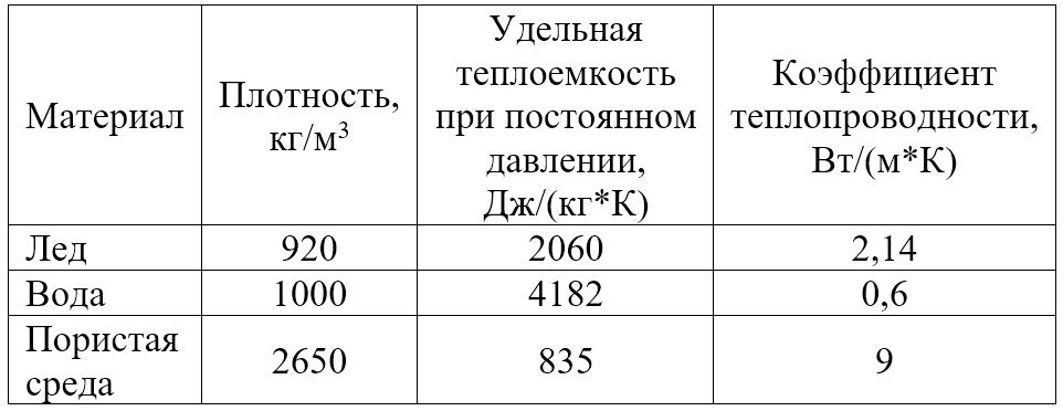 Таблица 1. Свойства льда, воды и пористой среды («скелета