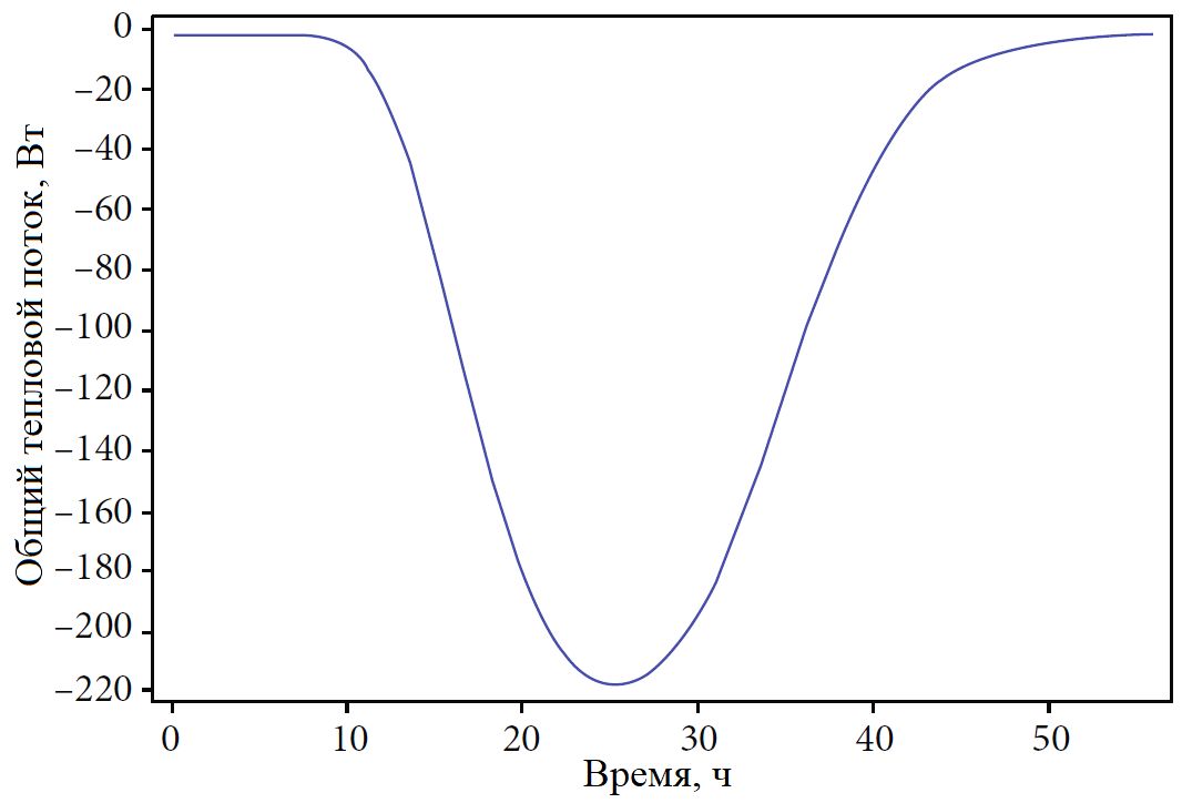 Рис. 4. Изменения общего теплового потока, выходящего из системы через выходную границу канала, в процессе таяния ледяного включения