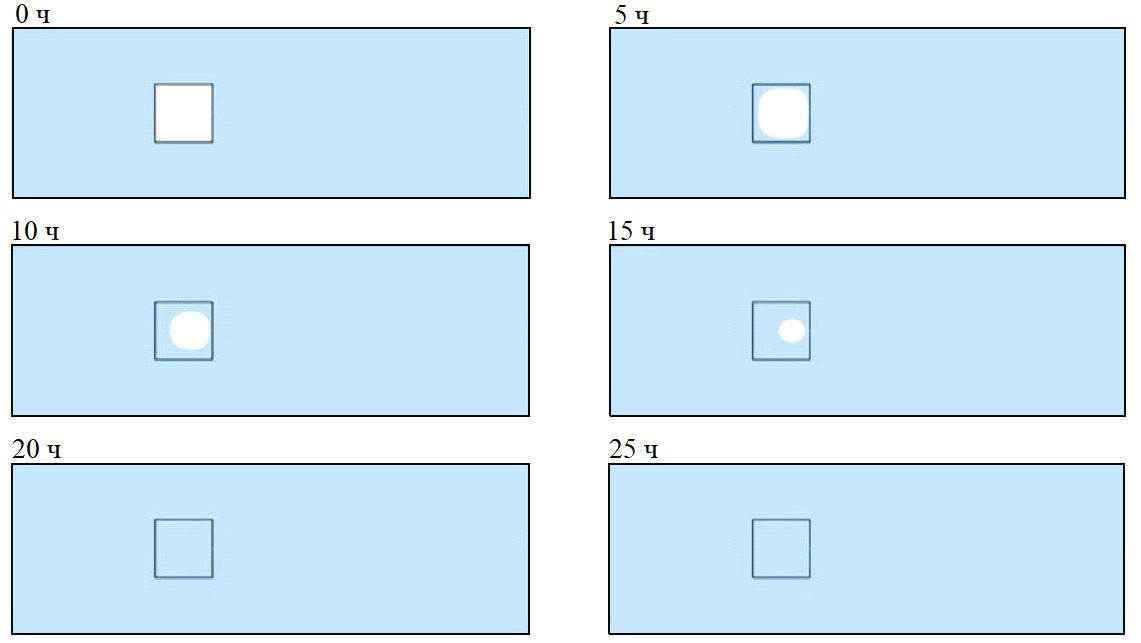 Модельные изменения в распределении жидкой воды в пористом канале показаны на рисунке 5. Видно, что ледяное включение начинает таять с четырех углов. Его левая сторона обращена навстречу к потоку жидкости, и скорость таяния льда слева выше, чем справа. В процессе оттаивания форма профиля включения постепенно меняется с квадратной на круглую и его размеры постепенно уменьшаются вплоть до полного исчезновения льда. Для показанных на рисунке 5 моментов времени видно, что через 20 ч лед полностью растаял, жидкая вода полностью заполнила поры канала, а ее общий объем постоянен (в соответствии с кривой, показанной на рисунке 2).