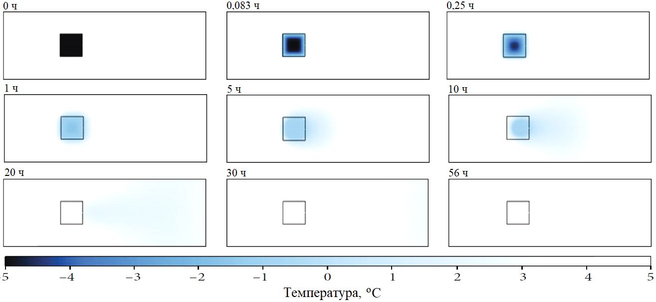 В начале моделирования температура грунта в основной части пористого канала составляла плюс 5 °C, а температура льда – минус 5 °C, в то же время минимальная температура в канале была равна температуре льда, то есть минус 5 °C. Через 56 часов минимальная температура во всем канале стала равной плюс 5 °C.