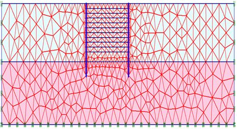 Численное моделирование проводилось методом конечных элементов в 2D постановке с использованием программного пакета PLAXIS [6]. Использованная сетка конечных элементов показана на рисунке 2. Она содержит приблизительно 900 треугольных 6-узловых элементов.