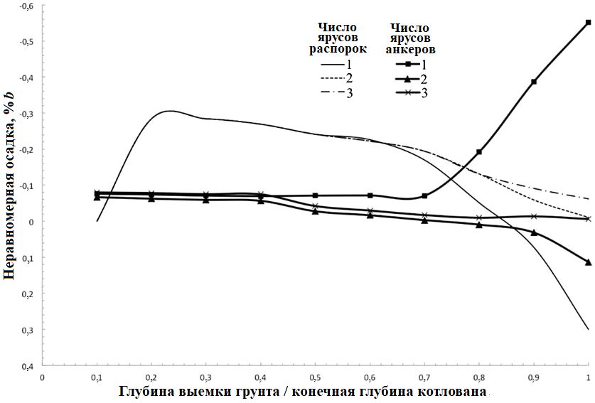 Что касается неравномерной осадки соседнего сооружения, то использование грунтовых анкеров (двух или трех ярусов) более эффективно для усиления подпорной стенки котлована, чем применение горизонтальных распорок. Причем при анкерном креплении максимальная неравномерная осадка достигается не в конце откопки котлована, а при выемке грунта на глубину 1 м и потом уменьшается благодаря установке двух или трех ярусов грунтовых анкеров (рис. 7).