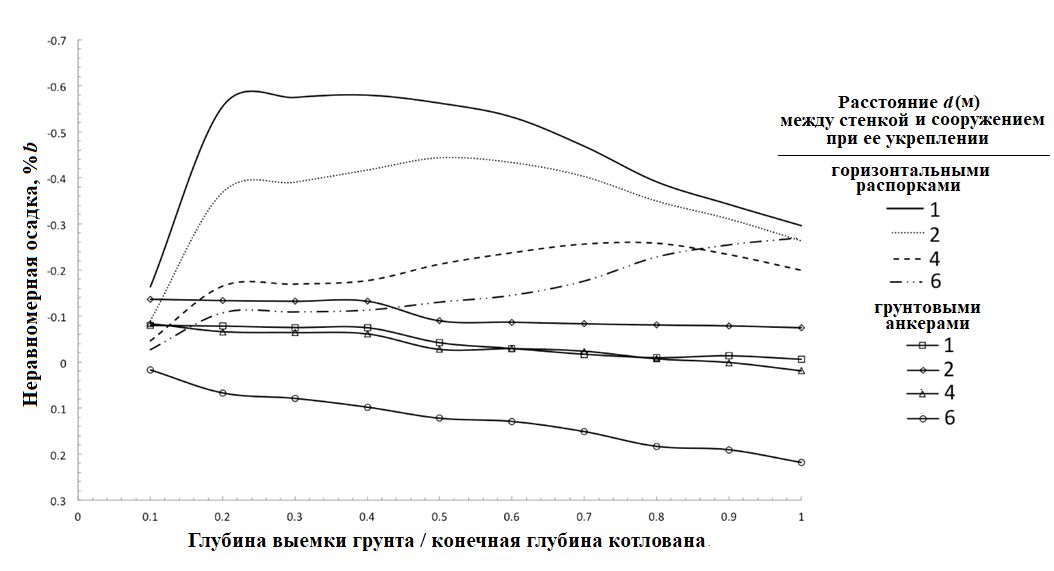 Самые большие неравномерные осадки соседнего сооружения происходят при использовании системы горизонтальных распорок. При увеличении расстояния d между подпорной стенкой и соседним сооружением они уменьшаются, причем достигаются при все большей глубине выемки грунта: при d=1 м максимальная неравномерная осадка (около минус 0,58%b) достигается при выемке на глубину 3 м, а при d=6 м ее максимальное значение (около минус 0,27%b) достигается при выемке на глубину 10 м.