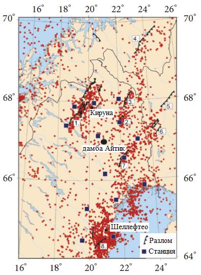 Рис. 1. Землетрясения, наблюдавшиеся с 1398 года и позже, из общего Скандинавского каталога Хельсинкского университета FENCAT (2011) и наблюдавшиеся с 2000 по 2011 год из каталога Университета города Уппсала по данным, зарегистрированным Шведской национальной сейсмической сетью (например, [2]). Местонахождение ограждающей дамбы хвостохранилища Айтик обозначено кружком. Красные точки — эпицентры землетрясений. Синие прямоугольники — шведские стационарные сейсмические станции. Цифрами обозначены постледниковые разломы: 1 — Парви, 2 — Мерашерви, 3 — Лайнио-Суиявора, 4 — Стуорагурра, 5 — Суасселка, 6 — Пасмаерви/Венеерви, 7 — Ланшерв, 8 — Буртреск (по [22])