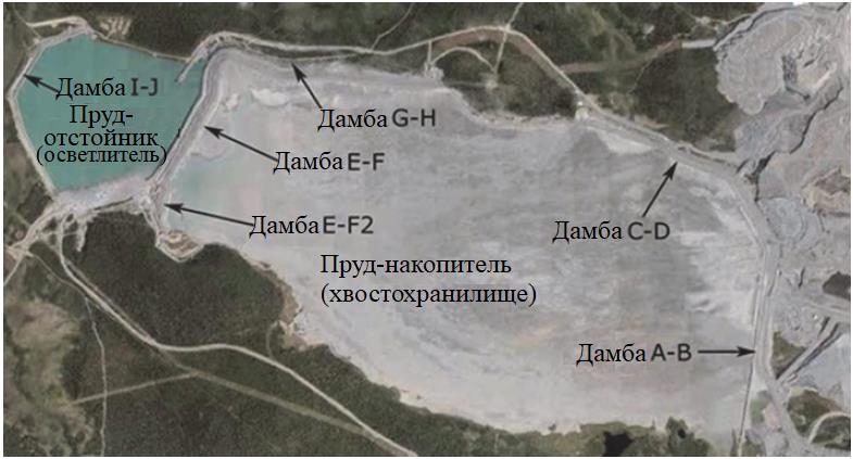 На рисунке 2 показано наливное хвостохранилище Айтик, которое занимает площадь 13 кв. км. Пруд-накопитель (собственно само хвостохранилище) удерживается четырьмя участками ограждающей дамбы под названиями «дамба A-B», «дамба C-D», «дамба E-F» (включая ее участок E-F2) и «дамба G-H». Пруд-отстойник (для осветления воды, «отжатой» из отстойника) расположен ниже дамбы E-F.
