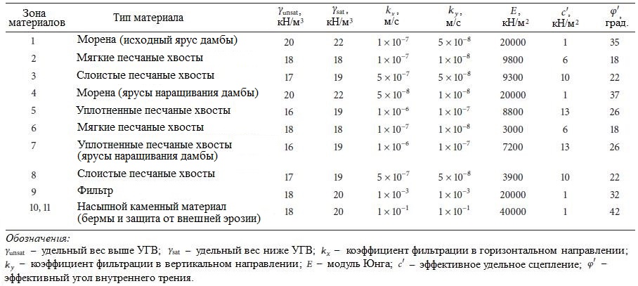 Значения модуля деформации, угла внутреннего трения, удельного сцепления, удельного веса и коэффициента фильтрации для зон хвостовых материалов были определены по результатам полевых и лабораторных испытаний. Соответствующие значения этих параметров для зон моренных отложений, фильтра и насыпного каменного материала были получены из доступной литературы [3, 42–45]. Вышеупомянутые параметры для зон всех материалов в дамбе E-F представлены в таблице 1. Следует помнить, что для динамического анализа модель Мора – Кулона использовалась только для неразжижаемых зон 1, 4, 9, 10 и 11 (см. рис. 3).