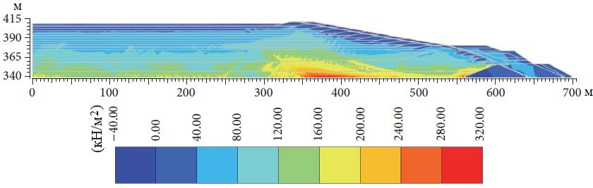 На рисунке 11 показаны избыточные поровые давления после 11-го этапа наращивания дамбы E-F до сейсмического события. На рисунках 12 и 13 показаны избыточные поровые давления, возникшие в результате обычного и экстремального землетрясений соответственно. Можно заметить, что наибольшее начальное избыточное поровое давление из-за статической нагрузки составляет 95 кПа (см. рис. 11). Как и следовало ожидать, наибольшие величины избыточного порового давления из-за сейсмических нагрузок увеличились примерно до 220 кПа после обычного землетрясения (см. рис. 12) и примерно до 320 кПа после экстремального события (см. рис. 13). Как и ожидалось, значения избыточного порового давления были выше для экстремального землетрясения по сравнению с нормальным. Рост избыточных поровых давлений произошел по всему телу дамбы. Максимальное увеличение наблюдалось в нижних частях дамбы ниже насыпных ярусов наращивания (см. рис. 12, 13). Как и ожидалось, из-за динамической нагрузки положительные избыточные давления поровой воды развились в сжимаемых зонах (в мягких и в слоистых песчаных хвостах), а отрицательные — в увеличивающих объем зонах дамбы (в уплотненных песчаных хвостах, в насыпных зонах из моренного материала и из каменного материала).