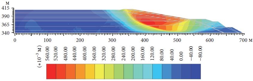 На рисунках 17 и 18 показаны прогнозируемые вертикальные смещения после сотрясения дамбы при обычном и экстремальном землетрясениях соответственно. Видно, что максимальные вертикальные смещения около 0,3 и 0,4 м в основном произошли на гребне насыпи при обычном и экстремальном землетрясениях соответственно. Такие вертикальные смещения допустимы, поскольку они гораздо меньше высоты «надводной» части внутренней стороны дамбы (расстояния по вертикали от поверхности хвостовой пульпы до гребня дамбы), которая составляет 2 м. В общем, считается, что такие величины общих смещений дамбы (см. [58]) находятся в допустимых пределах.