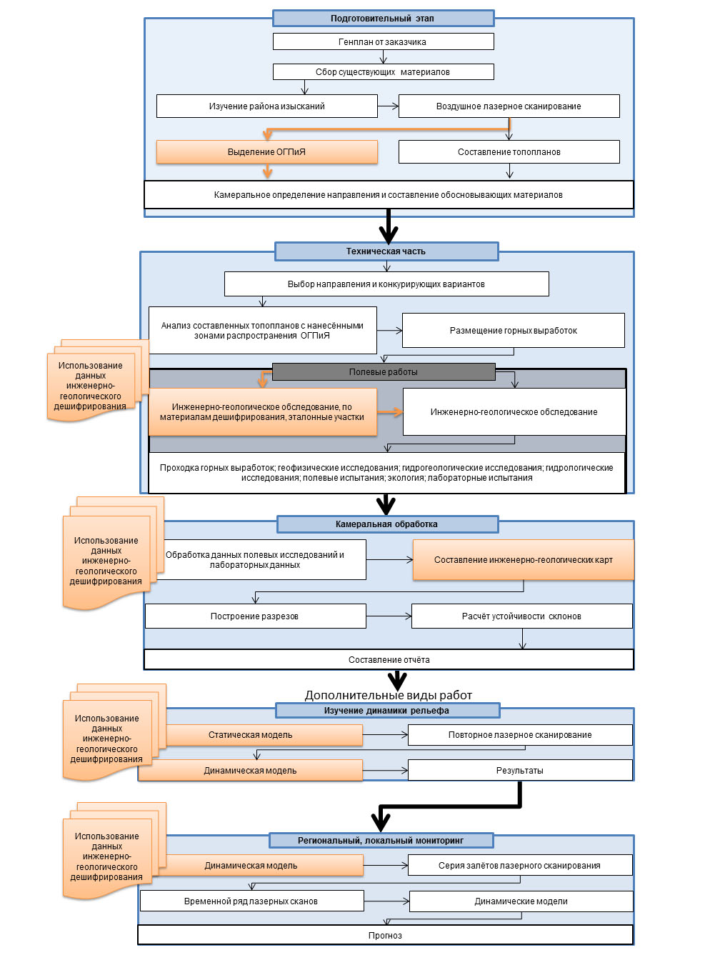 Таким образом, с учётом высоких требований к качеству выполнения работ на линейных и площадных объектах и минимальных сроков для сдачи отчётов, появляется необходимость применения традиционного геологического дешифрирования для минимизации перетрассировок или переносов проектов сооружений. Однако ранее использовавшиеся аэрометоды достаточно затратны по времени и финансам, и в настоящее время появилась необходимость в оптимизации цикла инженерно-геологических изысканий за счёт встраивания в него дешифрирования. Уникальность воздушного лазерного сканирования (высокая плотность точек измерений) и хорошая разрешающая способность камер для аэрофотосъёмки, используемых для топографических исследований, позволили использовать получаемые данные для инженерно-геологических изысканий линейных объектов.