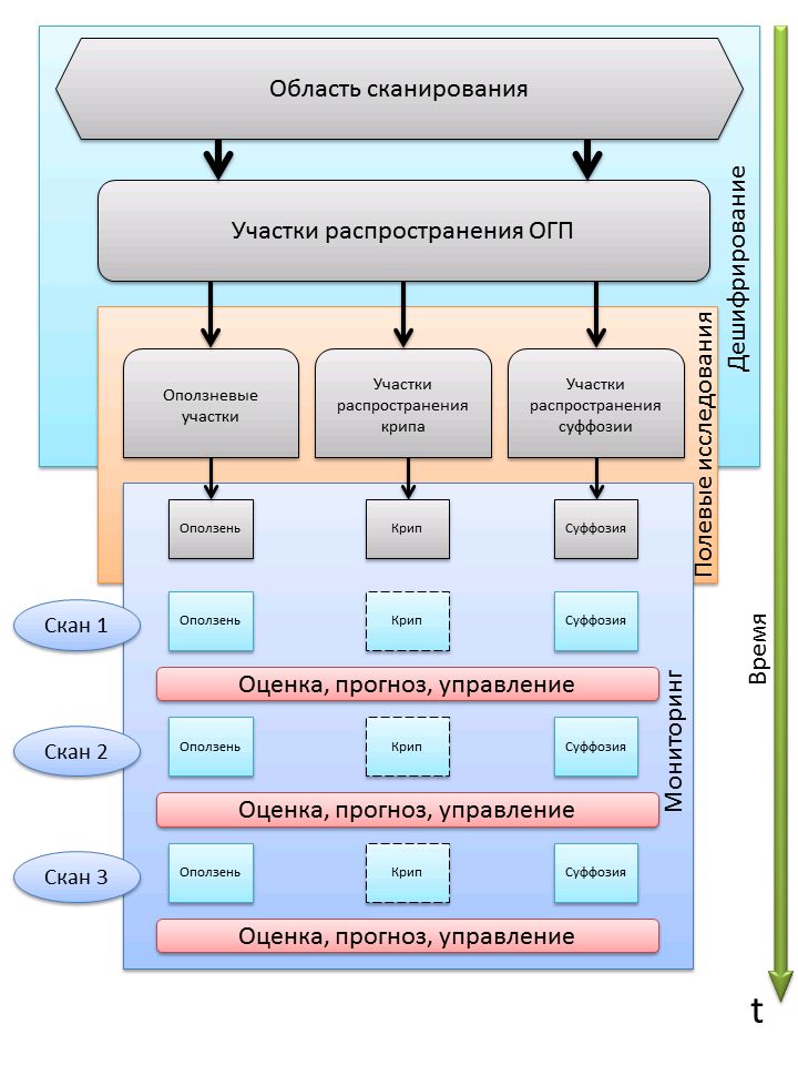 Исходя из этого, выстраивается концептуальная схема проведения всего цикла работ, распознавание опасных геологических процессов, полевая заверка (фотоотчёт) и проведение мониторинга (рис. 1).