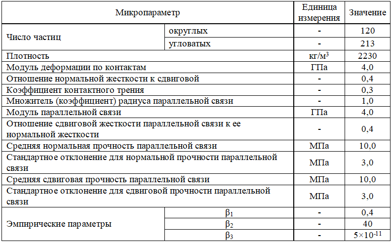 Каждая параллельная связь имеет пять параметров: нормальную и сдвиговую жесткость, нормальную и сдвиговую прочность и радиус. Как только нормальное или сдвиговое напряжение превышает прочность связи, она разрывается и появляется микротрещина. Более подробную информацию об использованной модели связей можно найти в публикации [13].