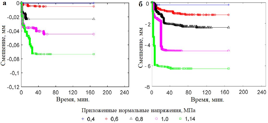 На рисунке 3 показаны типичные кривые ползучести (изменения смещений во времени) при каждом постоянном нормальном напряжении для модельных образцов каменной наброски с округлыми (а) и угловатыми (б) частицами. В обоих случаях происходило увеличение нормального смещения при росте приложенного нормального напряжения. По сравнению с образцами с округлыми частицами образцы с угловатыми частицами испытывали более сильные деформации ползучести при таком же нормальном напряжении.
