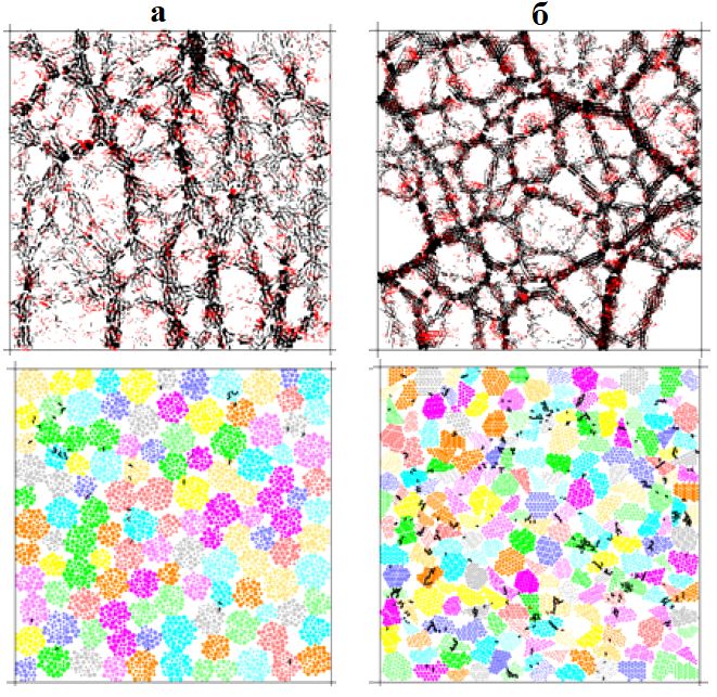 Рис. 5. Распределение сил связей (сцепления) и микротрещин при одноосном сжатии образцов каменной наброски с округлыми (а) и угловатыми (б) частицами