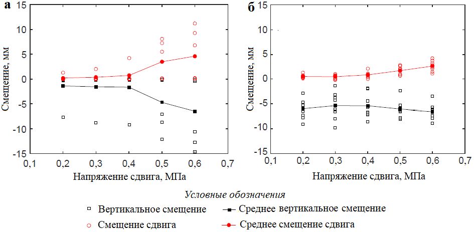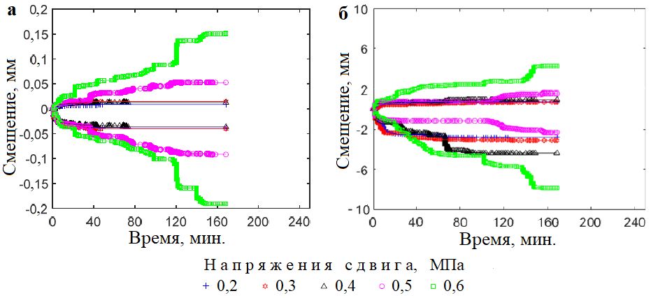 На рисунке 6 представлены типичные кривые развития смещений во времени при различных напряжениях сдвига. Характеристики деформаций сильно зависели от напряжения сдвига и формы частиц. Если напряжение сдвига было низким, то как нормальные, так и сдвиговые смещения быстро увеличивались, а затем оставались почти постоянным, что можно рассматривать как фазы первичной и вторичной ползучести. При высоком сдвиговом напряжении нормальные смещения были более значительными, чем сдвиговые. При этом как нормальные, так и сдвиговые смещения увеличивались с ростом напряжения сдвига. Однако приращения сдвигового смещения для образцов с округлыми частицами были более значительными.