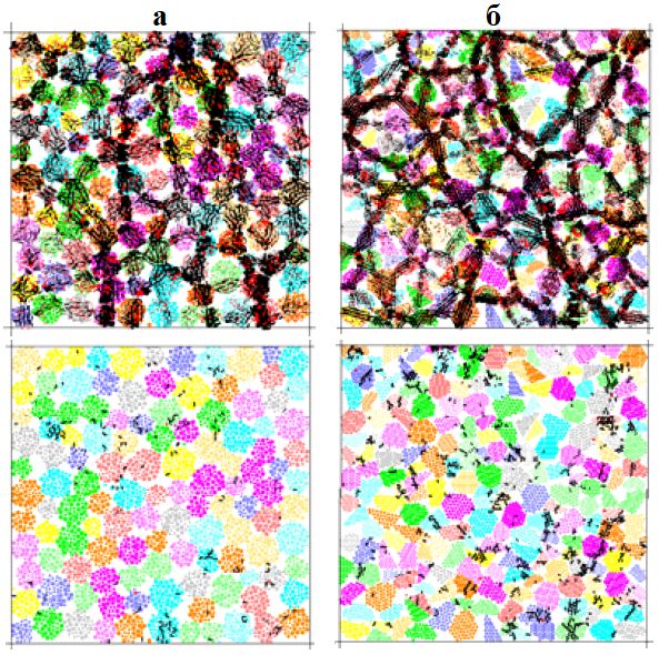 На рисунке 7 показаны примеры распределения сил связи (сцепления) и микротрещин через 10 тысяч секунд при сдвиговом напряжении 0,5 МПа. В образце с закругленными частицами силы сцепления были статистически более равномерно распределены, а микротрещины образовывались преимущественно «в углах» частиц. Однако в образце с угловатыми частицами появилось больше микротрещин, а фрагментация (дробление) частиц была более полной.