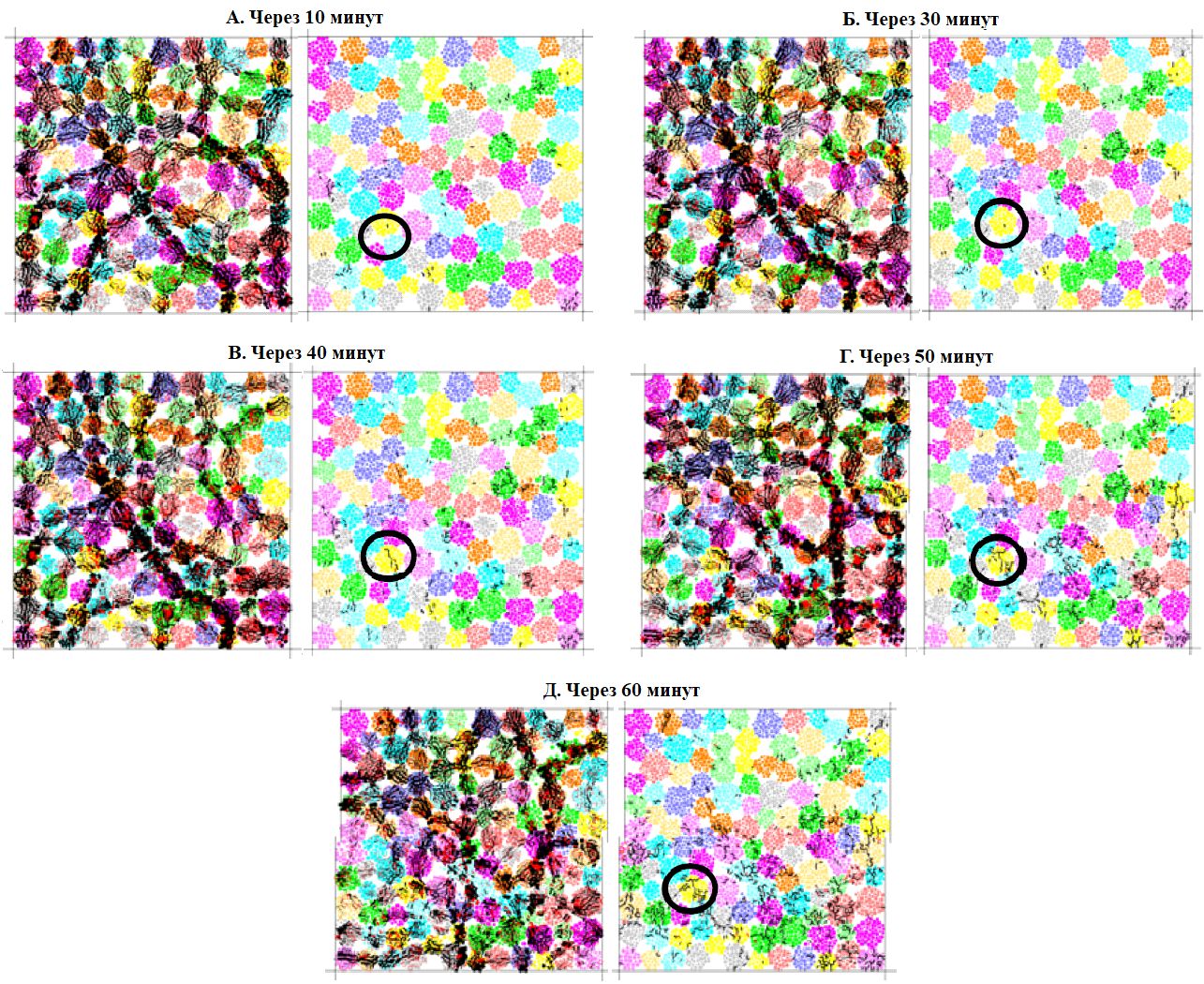 В цепочке усилий в качестве ключевой может быть определена частица, разрушение которой может вызвать цепную реакцию, в конечном итоге приводящую к разрушению образца. На рисунке 9 показаны случаи того, как она работает в образце с округлыми частицами в процессе развития ползучести. Через 10 минут цепочка усилий была стабильна и появилось небольшое количество микротрещин. Через 30 минут возникла полная фрагментация, однако смещения все еще были небольшими, то есть образец еще оставался устойчивым. Через 40 минут разрушилась ключевая частица, что привело к смене цепочек усилий и в результате – к многочисленным разрушениям в следующие 10 минут.