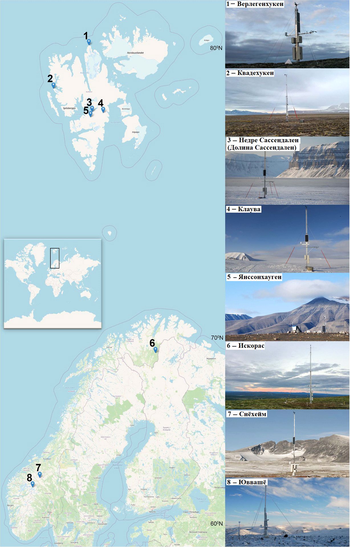Норвежские мерзлотные станции создаются в сотрудничестве с Университетом Осло, Университетским центром на Шпицбергене, Норвежским полярным институтом и Норвежским университетом наук и технологий. Четыре такие станции, расположенные в отдаленных местах на Шпицбергене (Верлегенхукен, Квадехукен, Недре-Сассендален и Клаува), были недавно созданы в рамках проектов Комплексной арктической системы наблюдений за Землей на Шпицбергене (Svalbard Integrated Arctic Earth Observing System) «Развитие инфраструктуры норвежского узла» (SIOS InfraNOR, https://siossvalbard. org/, Исследовательский совет Норвегии, проект № 269927) и Климатоэкологической обсерватории арктической тундры (Climate-ecological Observatory for Arctic Tundra  COAT, www.coat.нет/ru/). Часть работ, связанных с разработкой новых продуктов по многолетней мерзлоте, была выполнена при поддержке Программы мониторинга и оценки Арктики (Arctic Monitoring and Assessment Programme  AMAP).