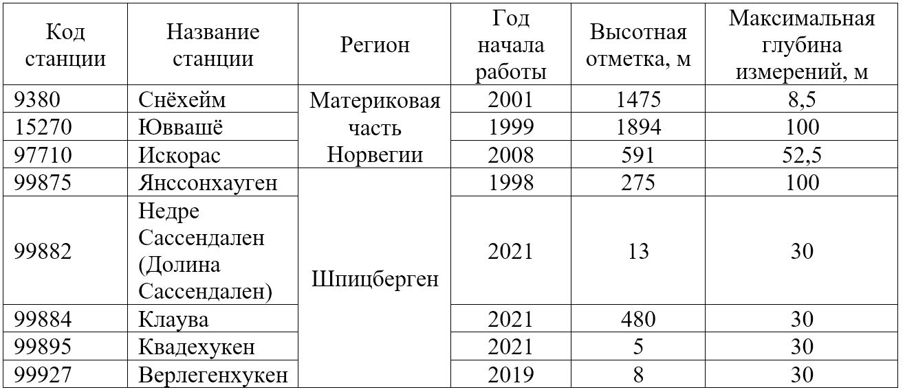 Таблица. Список мерзлотных станций (источник: https://cryo.met.no/ по состоянию на июль 2022 г.)
