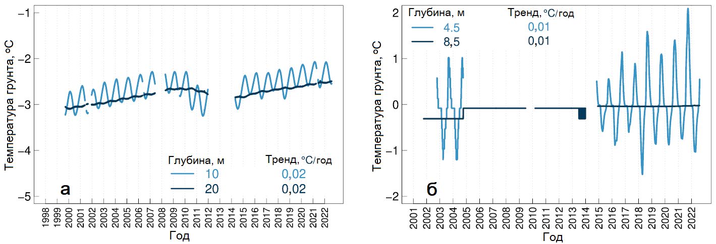 Рис. 3. Многолетние тренды изменений температуры грунта на станции Юввашё за период мониторинга 1999–2022 гг. (а) и в Снёхейме за период мониторинга 2001–2022 гг. (б). Примечание: временной ряд за 2022 год включает данные до 14.08.2022