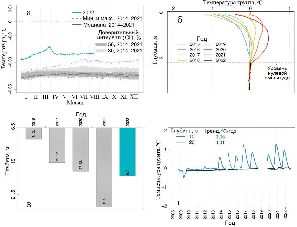Рис. 2. Многолетние тренды изменений температуры грунта на мерзлотной станции Янссонхауген за 1998–2022 гг.: а – долговременные изменения температурного режима многолетней мерзлоты на глубине 10 и 20 м; б – сезонные колебания температуры грунта на глубине 0,2; 1,6; 5; 10 м; в – максимальные за год глубины изотермы 0 °C с указанием на диаграмме соответствующих дат; г – профили среднегодовой температуры грунта и средняя глубина нулевой годовой амплитуды . Примечание: временные ряды за 2022 год включают данные до 05.08.2022