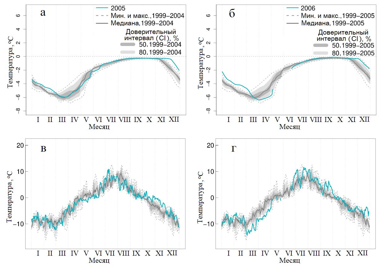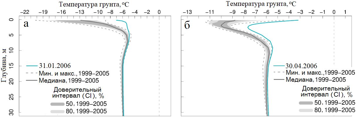 На рисунке 7 показаны профили температуры грунта в конце января и в апреле 2006 года для станции Янссонхауген на Шпицбергене. В слоях многолетней мерзлоты вблизи поверхности (до глубины 5–10 м) наблюдались очень высокие температуры, существенно превышавшие их максимальные значения в предыдущие годы. Температура грунта составляла минус 7 °С в январе и минус 3 °С в апреле (обычно в те же дни и на той же глубине средние температуры были на 6 °C ниже).