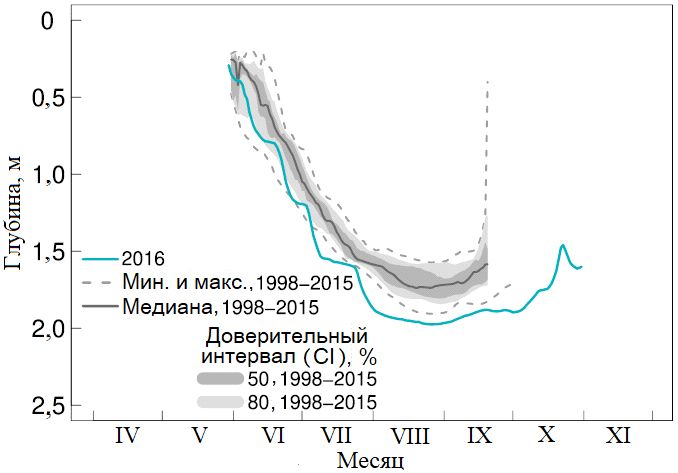 На рисунке 6 показаны изменения глубины изотермы 0 °C в Янссонхаугене на Шпицбергене за 2016 год. Видно, что положение изотермы 0 °C уже в конце мая и начале июня находится глубже медианы предыдущих лет для конца мая и начала июня. В июле она достигает новой рекордно большой глубины и остается ниже предыдущей максимальной глубины до октября. Это означает рекордно высокую толщину деятельного слоя грунта в этом месте. Обычно слой сезонного оттаивания замерзал в течение сентября или первых дней октября каждый год с момента начала измерений в Янссонхаугене. В 2016 году деятельный слой не замерзал до начала ноября. Такая экстремальная глубина оттаивания и длительное замерзание сопровождались аномально большим количеством дождевых осадков, что привело к нескольким оползням и селевым потокам в близлежащем городе Лонгйирбиен и его окрестностях [36]. Жители домов, которые раньше были безопасными, были срочно эвакуированы. Местность, в которой раньше обычно совершались пешие прогулки, стала опасной. Дороги, которыми пользовались в предыдущие годы, были закрыты до тех пор, пока неустойчивые склоны над ними не промерзли.
