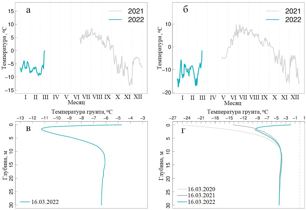 Рис. 8. Температура грунта вблизи поверхности в 2021 и 2022 годах (а, б) и ее изменения с глубиной 16 марта 2022, 2021, 2022 годов (в, г) на Шпицбергене: на станции Квадехукен на глубине 0,05 м (а); на станции Недре Сассендален на глубине 0,05 м (б); на станции Клаува (в); на станции Ферлегенхукен (д)