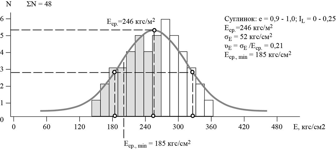 таблицы нормативных значений модулей деформации составлялись с достаточной осторожностью; например, на рис. 1 показано, что из выборки 48 испытаний элювиального суглинка (26 из них штампы, остальные компрессия с «поправками Агишева – Игнатовой» было получено среднее значение Еср.= 24.6 МПа, а в СП 22 [5] включено так называемое среднеминимальное значение Еср, min = 19 МПа, на 23% ниже;