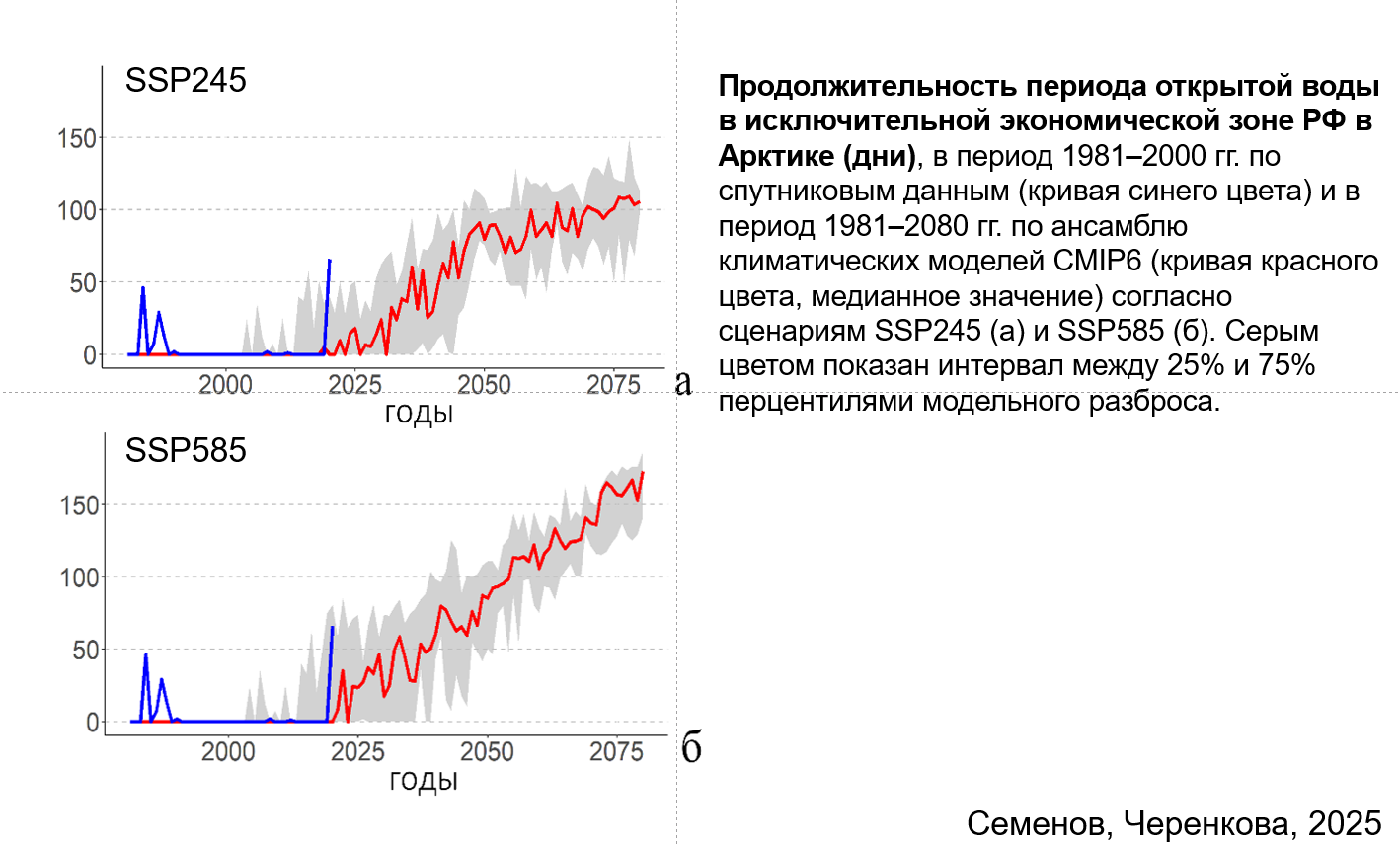 В заключении своего доклада Владимир Семёнов сделал важные прикладные выводы. Прежде всего, про Северный морской путь, проблемой которого, по его словам, в институте занимаются с 2010-х годов. Моделирование показывает рост продолжительности безлёдной навигации при разных сценариях: в перспективе она может увеличиться до шести месяцев. Аналогичные расчёты делаются для западной части Карского моря, где сосредоточены крупные проекты по добыче углеводородов.