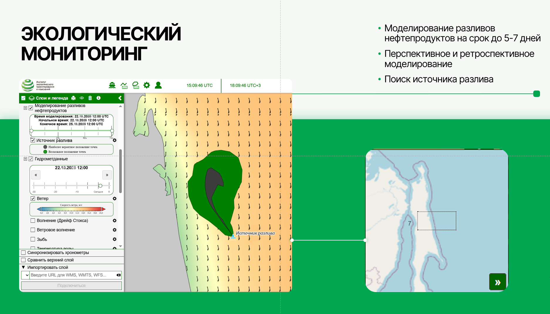 Отдельное внимание в докладе было уделено экологическому мониторингу. Как подчеркнул Д. Корнилов, использование радиолокационных данных позволяет обнаруживать нефтяные пленки даже при сложных погодных условиях. «Используя сочетание методов радиолокации, мультиспектральной съёмки и автоматических классификаторов, система обеспечивает обнаружение нефтяной плёнки как в открытом море, так и в прибрежных акваториях, в том числе при высоких скоростях ветра. Специальный модуль нашей системы выполняет прогноз дрейфа нефтяных пятен, выявленных по спутниковым данным. Алгоритм настроен так, что мы можем не только прогнозировать направление дрейфа объекта, но и определить его первоисточник, примерное время появления».