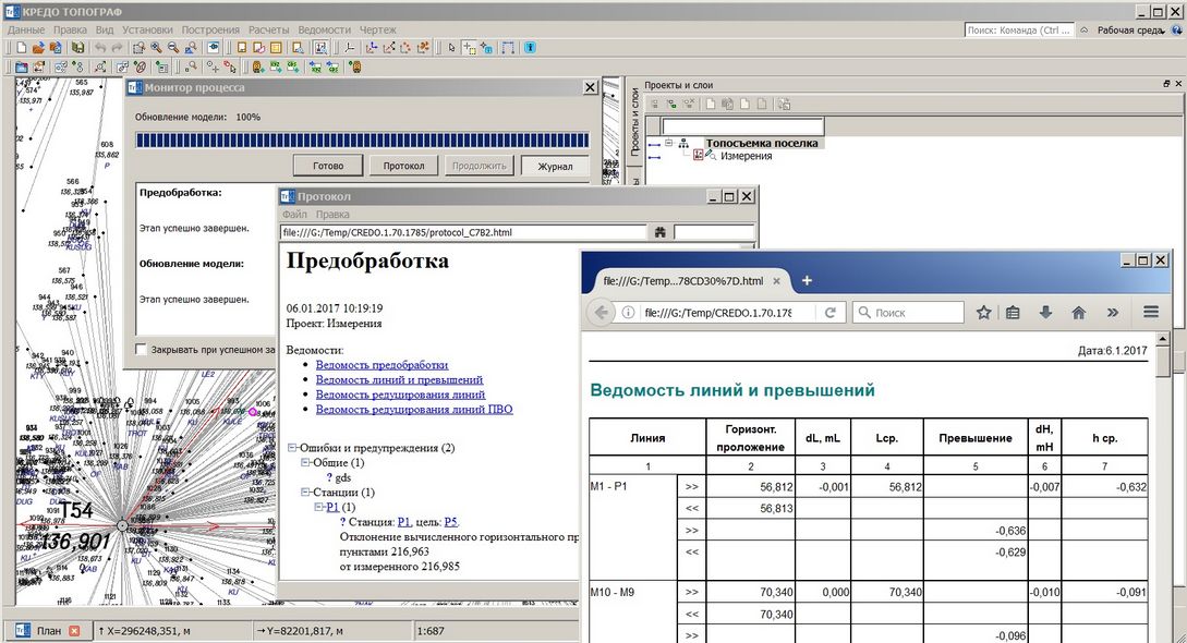 Технология обработки данных достаточно проста. Сначала вводятся координаты исходных пунктов, после чего выполняется предварительная обработка измерений, в процессе которой вычисляются средние значения, производится их контроль на соответствие допускам, а также учитываются различные поправки. Процесс расчета сопровождается текстовыми сообщениями в специализированном окне протокола. При наличии проблем можно выполнить поиск грубых ошибок методом трассирования. Подробные результаты расчетов, произведенных в процессе предобработки, можно просмотреть в специализированных ведомостях (рис. 2).