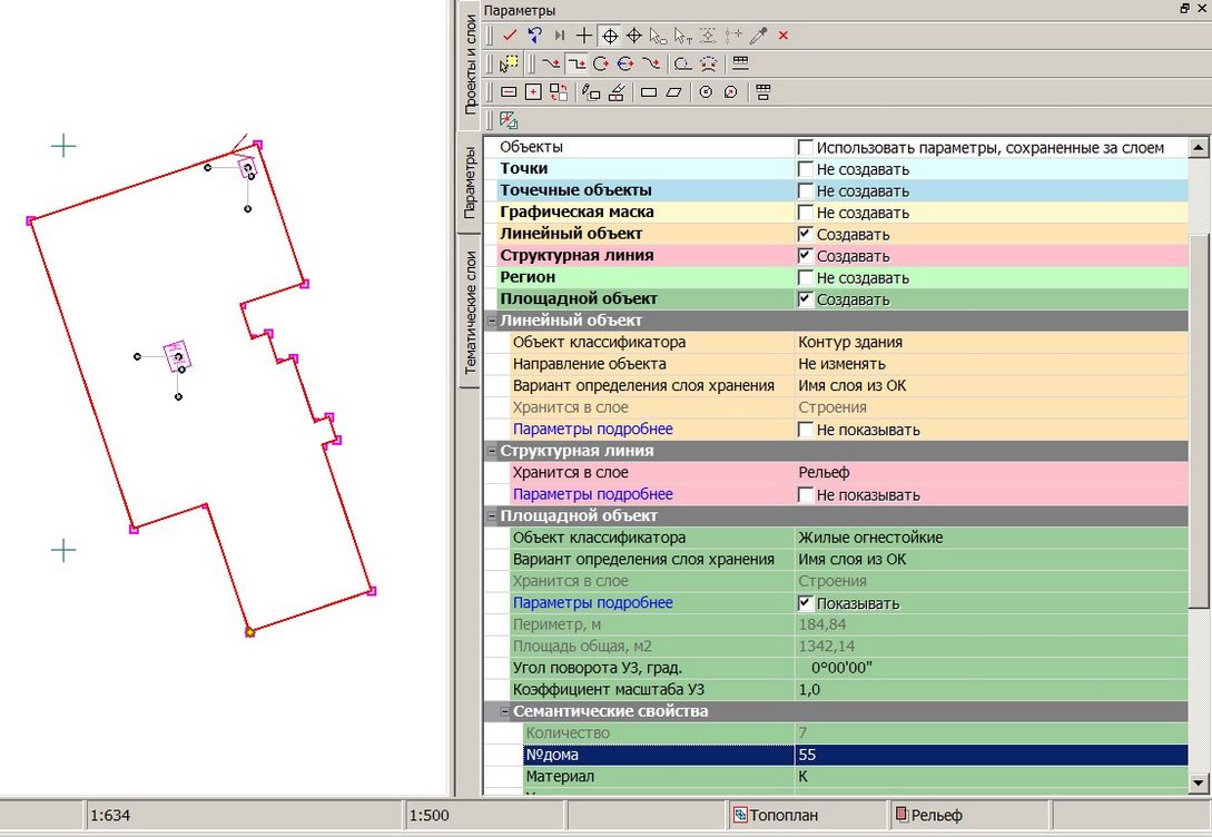 Цифровая модель ситуации состоит из точечных, линейных и площадных объектов, которые создаются в соответствии с классификатором, определяющим настройки их отображения условными знаками, перечень необходимых семантических характеристик и условия использования их значений в подписях объектов на плане. Необходимо подчеркнуть, что все перечисленные настройки задаются для определенных диапазонов масштабов, что позволяет в автоматическом режиме менять условные обозначения объектов в зависимости от требуемого масштаба плана.
