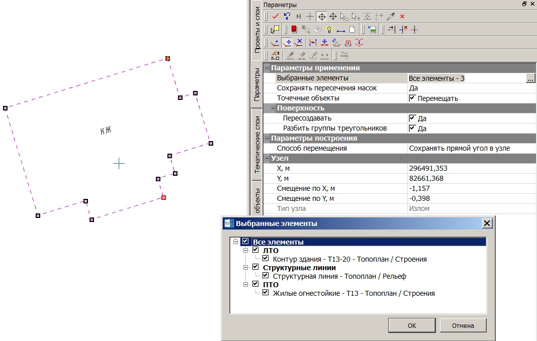 Все методы редактирования геометрии объектов тоже собраны в одной команде и позволяют при необходимости вносить правки в положение всех объектов – при изменении узлов, звеньев или даже сегментов линий, изменятся все элементы, которые через них проходят (ТТО, линии, контуры). При этом в методах реализованы достаточно интересные возможности, позволяющие, например, сохранять прямоугольники при изменении положения вершин или сторон, а также преобразовывать и достраивать целые сегменты исходных объектов, двигая их произвольно или по соседним звеньям.