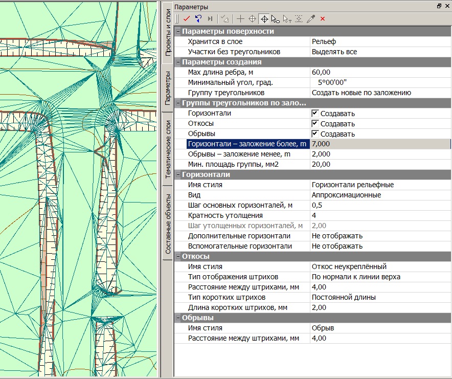 Так, первая команда позволяет работать с точками и структурными линиями как всего слоя сразу, так и в интерактивно построенном контуре: при запуске расчета система анализирует наличие построенной ограничивающей области, и в зависимости от этого работает с данными либо только в ней, либо в пределах всего слоя. Причем в местах отсутствия триангуляции она будет создана, а там, где есть – перестроена. Кроме этого, здесь же можно выполнить настройки, позволяющие в процессе расчета автоматически исключать узкие треугольники, а также выделять участки с характерными формами рельефа: руководствуясь заданными диапазонами уклонов, система объединит треугольники в группы и назначит им необходимый стиль отображения (горизонтали, откосы, обрывы), которые при необходимости можно изменить интерактивно (рис. 7).