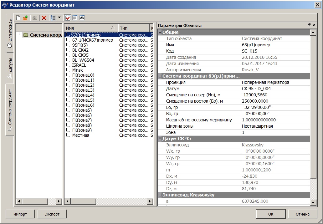 В основе работ с системами координат лежит специальный Редактор, функциональность которого позволяет создавать и редактировать параметры датумов, эллипсоидов и самих систем (рис. 8).