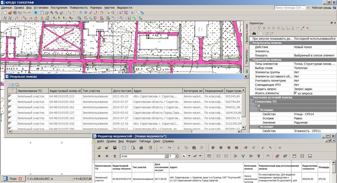 Помимо ведомостей по результатам обработки измерений, о которых упоминалось выше, система имеет гибкие возможности настройки шаблонов ведомостей по объектам ситуации и их семантическим свойствам. Такой способ создания ведомостей предпочтительно использовать при необходимости вывода определенных данных в неизменном виде. При возникновении потребности оперативно сформировать ведомость с произвольными данными можно задействовать команду поиска данных, позволяющую создавать запросы и искать по ним различные (включая разнотипные) тематические объекты, в том числе и по значениям их семантических свойств. Найденная информация может быть представлена в виде таблицы, внешний вид которой достаточно просто изменить: скрыть лишние столбцы или поменять их порядок можно всего несколькими движениями. Нажатием одной кнопки текущее представление таблицы сохраняется в файл формата HTML и открывается в Редакторе ведомостей, функциональность которого позволяет продолжить форматирование как самой таблицы, так и текста (рис. 10).
