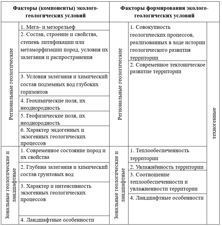 Таблица 1. Факторы эколого-геологических условий и факторы формирования эколого-геологических условий [2]